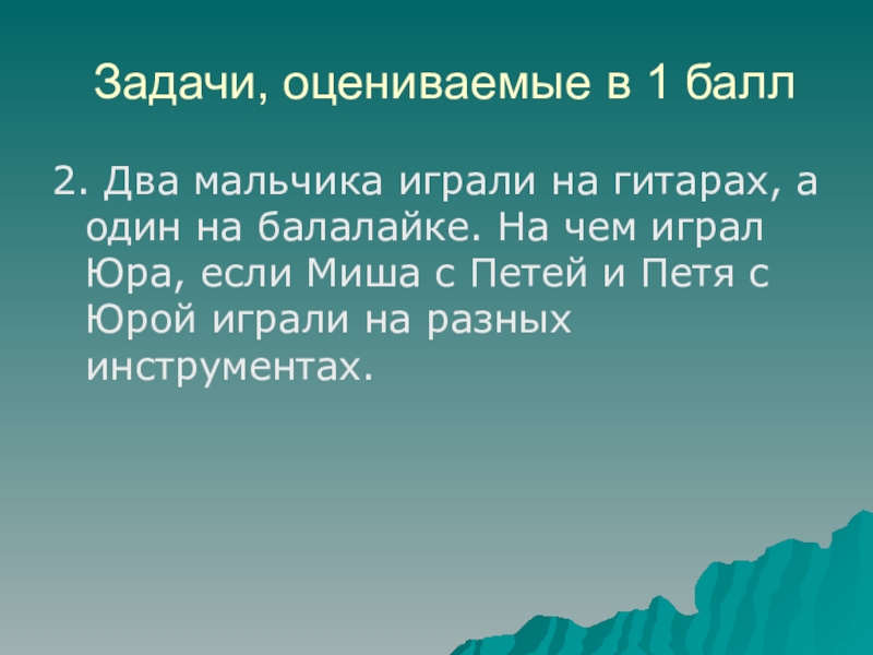 один на балалайке. На чем играл Юра, если Миша с Петей и Петя с Юрой играли на разных инструментах.