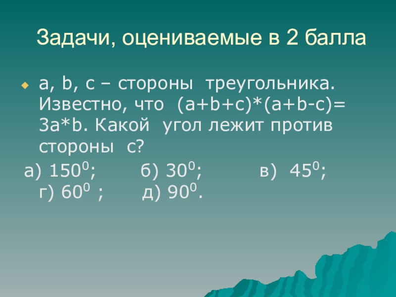 что (a+b+c)*(a+b-c)= 3a*b. Какой угол лежит против стороны c?