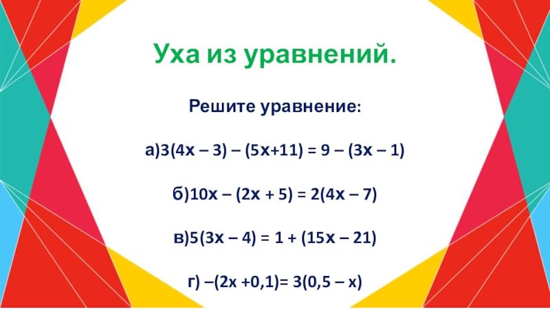 Уха из уравнений. Решите уравнение:  а)3(4х – 3) – (5х+11) = 9 – (3х – 1) б)10х