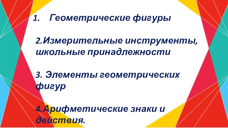 Геометрические фигуры2.Измерительные инструменты, школьные принадлежности3. Элементы геометрических фигур4.Арифметические знаки и действия.