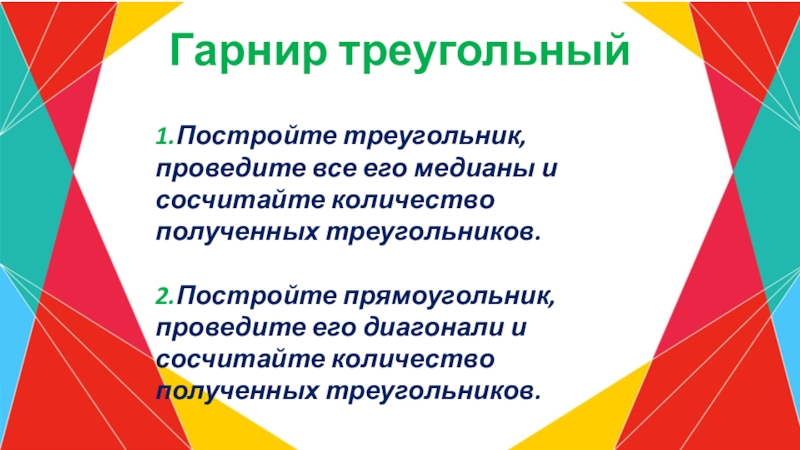 Гарнир треугольный 1.Постройте треугольник, проведите все его медианы и сосчитайте количество полученных треугольников.  2.Постройте прямоугольник, проведите его