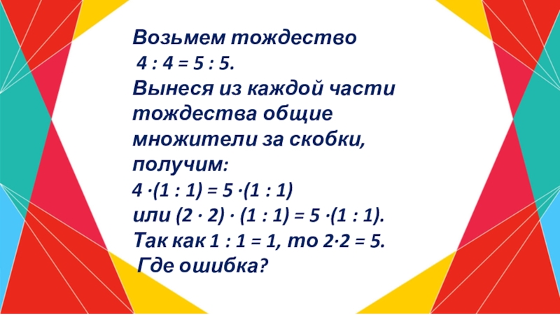 Возьмем тождество 4 : 4 = 5 : 5.Вынеся из каждой части тождества общие множители за скобки,