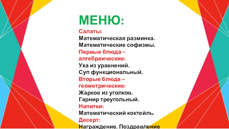 МЕНЮ:Салаты: Математическая разминка.  Математические софизмы.  Первые блюда – алгебраические: Уха из уравнений. Суп функциональный.  Вторые блюда – геометрические: Жаркое из уголков.  Гарнир треугольный.  Напитки: Математический коктейль.  Десерт: Награждение. Поздравление победителей.