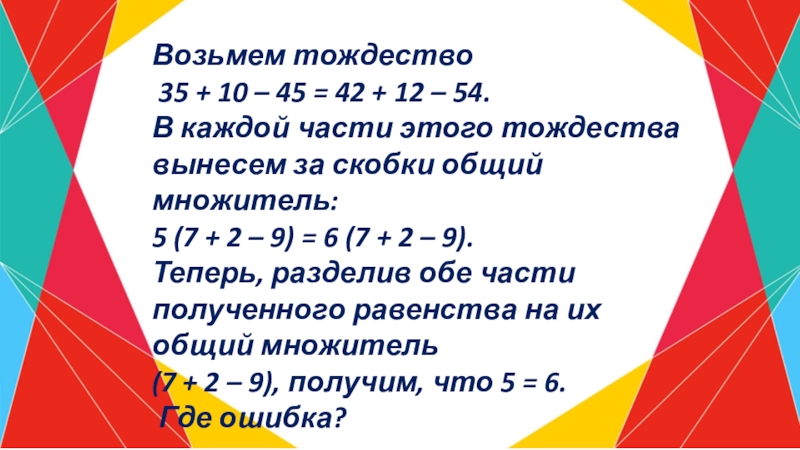 Теперь, разделив обе части полученного равенства на их общий множитель  (7 + 2 – 9), получим, что 5 = 6.