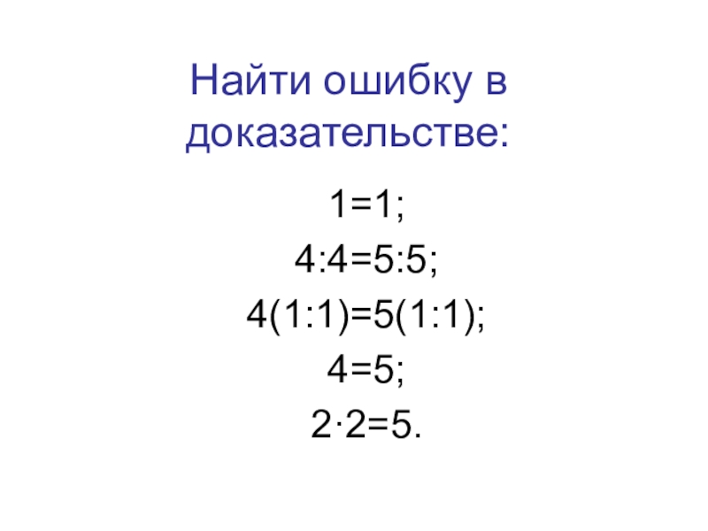 Найти ошибку в доказательстве:1=1;4:4=5:5;4(1:1)=5(1:1);4=5;2·2=5.