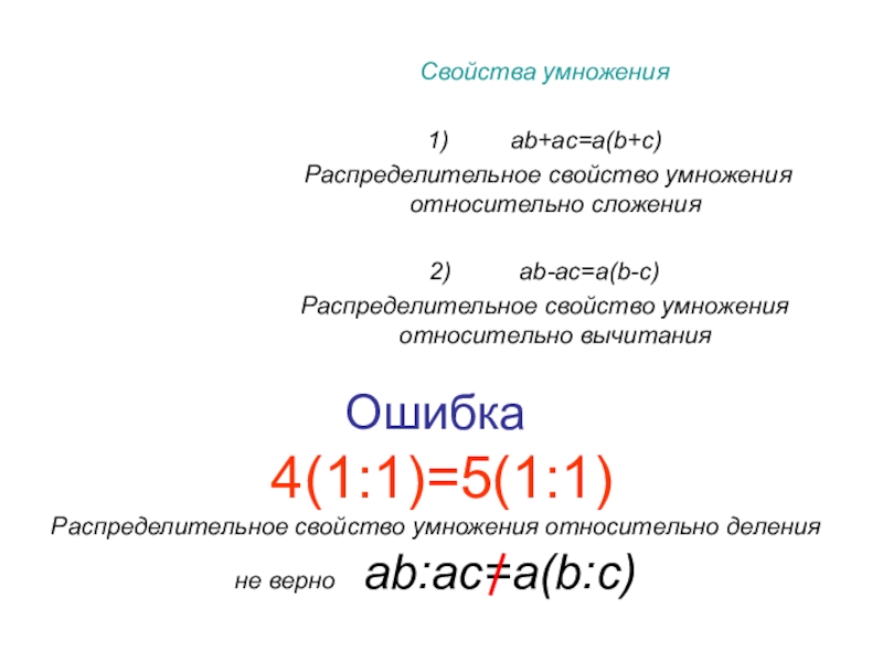 Ошибка 4(1:1)=5(1:1) Распределительное свойство умножения относительно деления не верно ab:ac=a(b:c)Свойства умножения1) ab+ac=a(b+c) Распределительное свойство умножения относительно сложения 2) ab-ac=a(b-c)Распределительное свойство умножения относительно вычитания