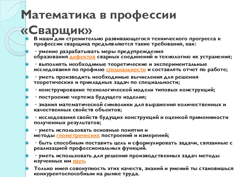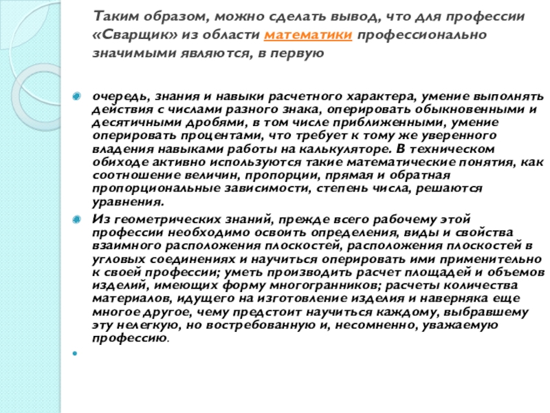 Из геометрических знаний, прежде всего рабочему этой профессии необходимо освоить определения, виды и свойства взаимного расположения плоскостей, расположения плоскостей в угловых соединениях и научиться оперировать ими применительно к своей профессии; уметь производить расчет площадей и объемов изделий, имеющих форму многогранников; расчеты количества материалов, идущего на изготовление изделия и наверняка еще многое другое, чему предстоит научиться каждому, выбравшему эту нелегкую, но востребованную и, несомненно, уважаемую профессию.