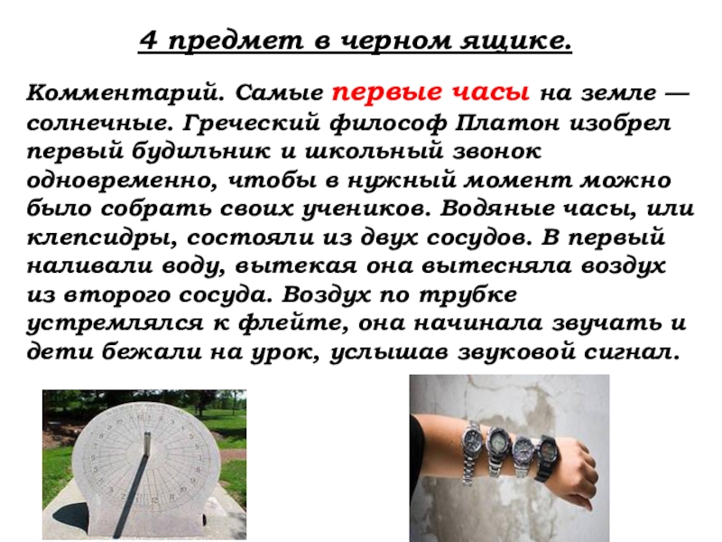 — солнечные. Греческий философ Платон изобрел первый будильник и школьный звонок одновременно, чтобы в нужный момент можно было собрать своих учеников. Водяные часы, или клепсидры, состояли из двух сосудов. В первый наливали воду, вытекая она вытесняла воздух из второго сосуда. Воздух по трубке устремлялся к флейте, она начинала звучать и дети бежали на урок, услышав звуковой сигнал.