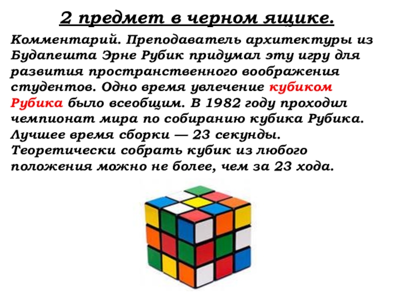 придумал эту игру для развития пространственного воображения студентов. Одно время увлечение кубиком Рубика было всеобщим. В 1982 году проходил чемпионат мира по собиранию кубика Рубика. Лучшее время сборки — 23 секунды.