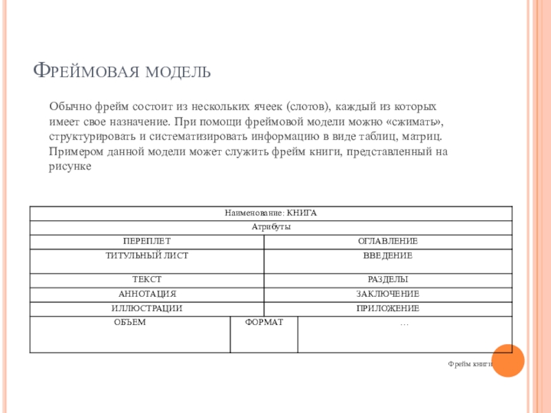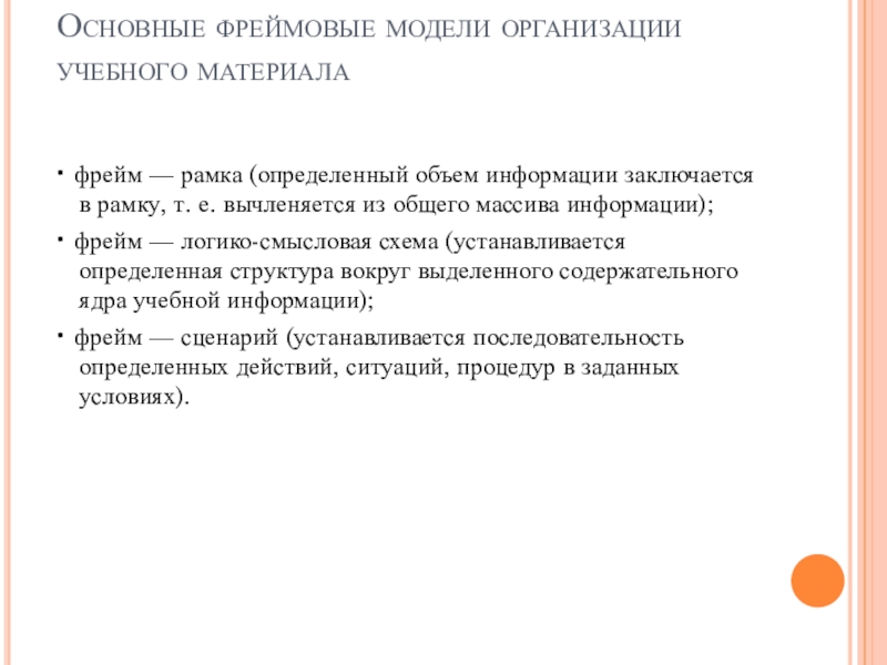 Фрейм — логико-смысловая схема. Фрейм, принадлежащий этой модели, выполняет функции скелета, каркаса, устанавливающего наиболее типичные, значимые, системообразующие связи между смысловыми ячейками.