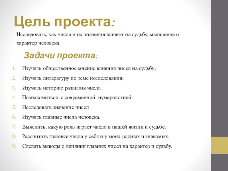 Выяснить, какую роль играет число в нашей жизни и судьбе.