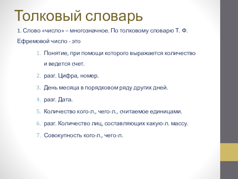 1. Слово «число» – многозначное. По толковому словарю Т. Ф.