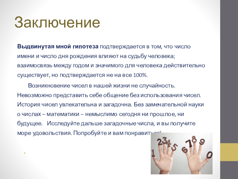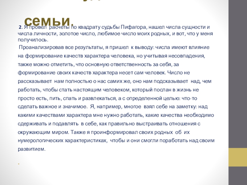 Проанализировав все результаты, я пришел к выводу: числа имеют влияние на формирование качеств характера человека, но учитывая несовпадения, также можно отметить, что основную ответственность за себя, за формирование своих качеств характера несет сам человек. Число не рассказывает нам полностью о нас самих же, оно нам подсказывает над, чем работать, чтобы стать настоящим человеком, который послан в жизнь не просто есть, пить, спать и развлекаться, а с определенной целью: что-то сделать важное и значимое. Я, например, многое взял себе на заметку: над какими качествами характера мне нужно работать, какие качества необходимо сдерживать и подавлять в себе, как правильно выстраивать отношения с окружающим миром. Также я проинформировал своих родных об их нумерологических характеристиках, чтобы и они смогли поработать над своим развитием.