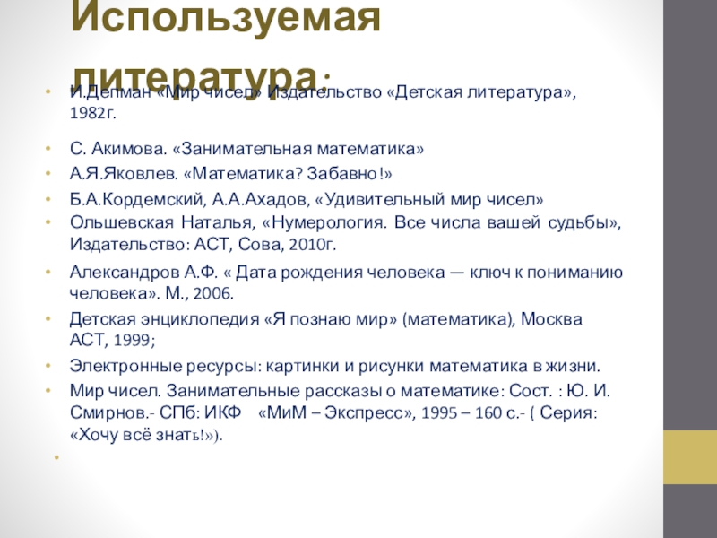 Мир чисел. Занимательные рассказы о математике: Сост. : Ю. И. Смирнов.- СПб: ИКФ «МиМ – Экспресс», 1995 – 160 с.- ( Серия: «Хочу всё знать!»).