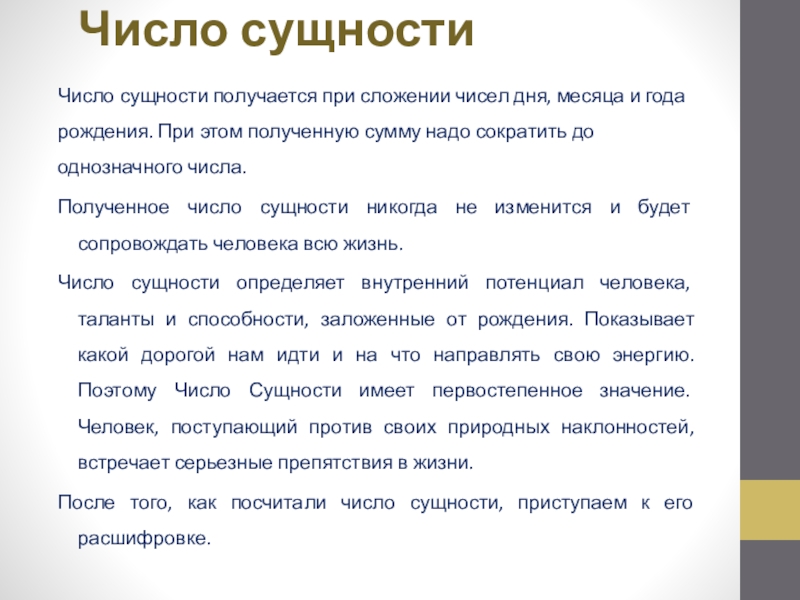 Число сущности определяет внутренний потенциал человека, таланты и способности, заложенные от рождения. Показывает какой дорогой нам идти и на что направлять свою энергию. Поэтому Число Сущности имеет первостепенное значение. Человек, поступающий против своих природных наклонностей, встречает серьезные препятствия в жизни.