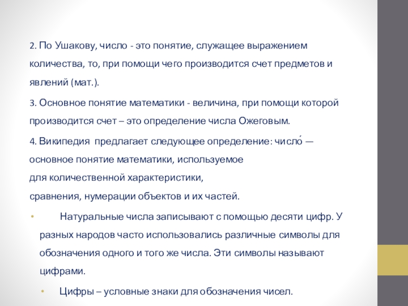 Слайд 102. По Ушакову, число - это понятие, служащее выражением количества, то,