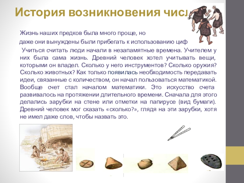 Учиться считать люди начали в незапамятные времена. Учителем у них была сама жизнь. Древний человек хотел учитывать вещи, которыми он владел. Сколько у него инструментов? Сколько оружия? Сколько животных? Как только появилась необходимость передавать идеи, связанные с количеством, он начал пользоваться математикой. Вообще счет стал началом математики. Это искусство счета развивалось на протяжении длительного времени. Сначала для этого делались зарубки на стене или отметки на папирусе (вид бумаги). Древний человек мог сказать «сколько?», глядя на эти зарубки, хотя не имел даже слов, чтобы назвать это.
