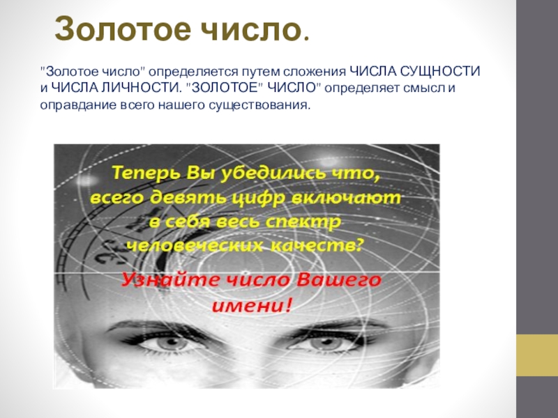 "Золотое число" определяется путем сложения ЧИСЛА СУЩНОСТИ и ЧИСЛА ЛИЧНОСТИ.