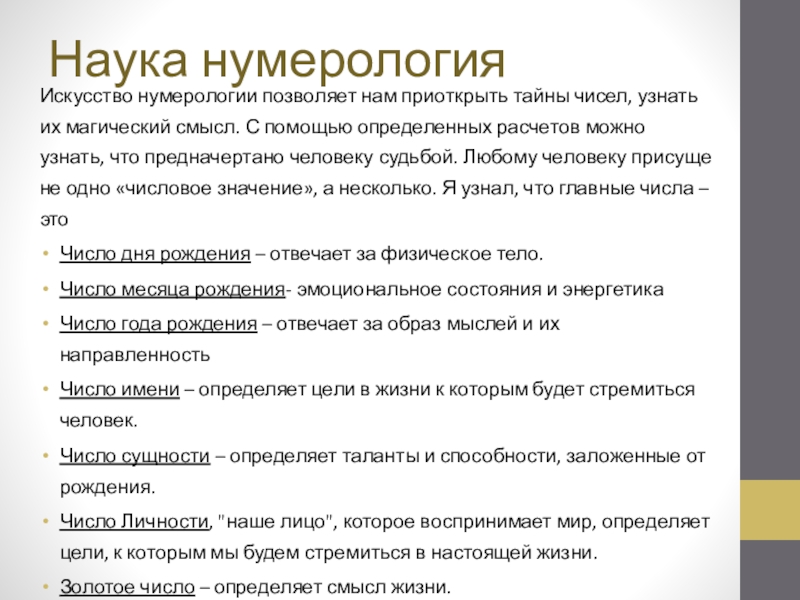 смысл. С помощью определенных расчетов можно узнать, что предначертано человеку судьбой. Любому человеку присуще не одно «числовое значение», а несколько. Я узнал, что главные числа – это