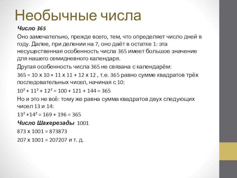 365 = 10 х 10 + 11 х 11 + 12 х 12 , т.е. 365 равно сумме квадратов трёх последовательных чисел, начиная с 10: