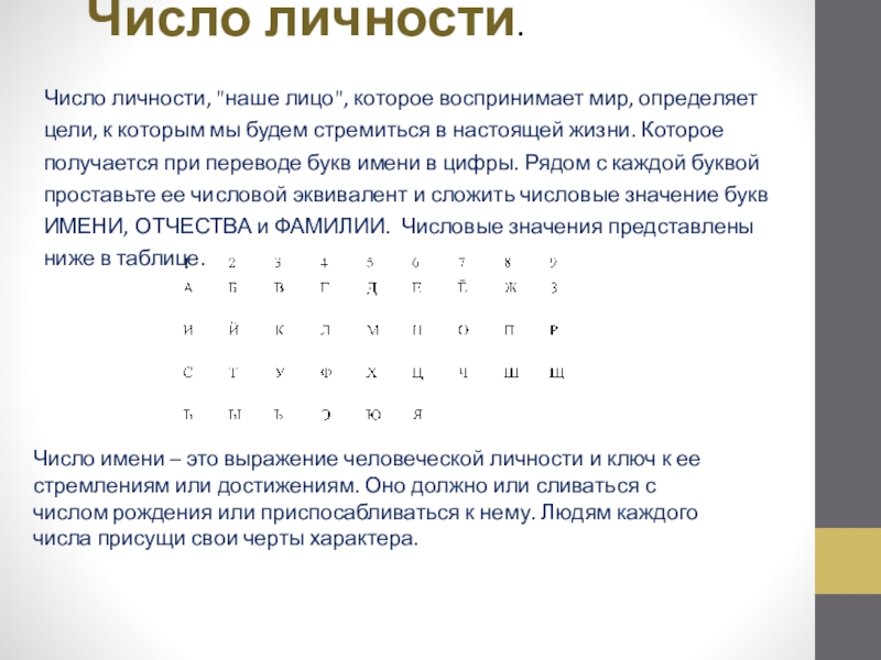 которым мы будем стремиться в настоящей жизни. Которое получается при переводе букв имени в цифры. Рядом с каждой буквой проставьте ее числовой эквивалент и сложить числовые значение букв ИМЕНИ, ОТЧЕСТВА и ФАМИЛИИ. Числовые значения представлены ниже в таблице.