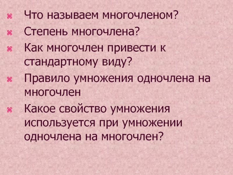 Что называем многочленом?Степень многочлена?Как многочлен привести к стандартному виду? Правило умножения одночлена на многочленКакое свойство умножения используется