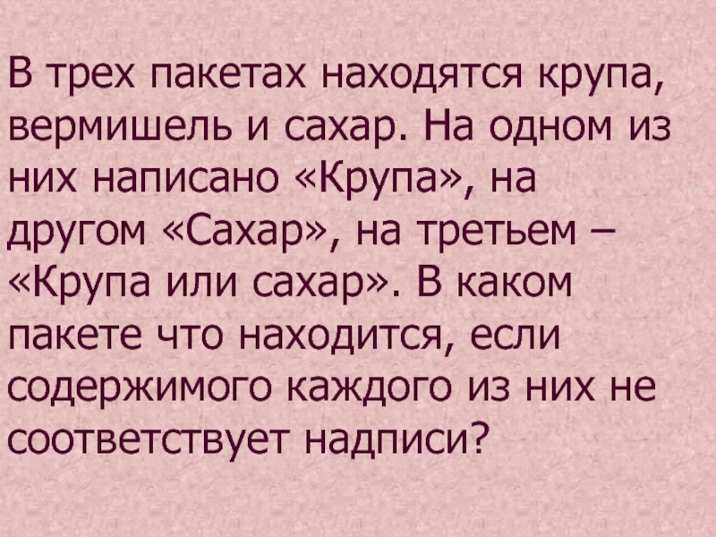 Слайд 4В трех пакетах находятся крупа, вермишель и сахар. На одном из