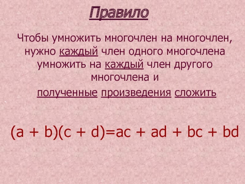 Правило Чтобы умножить многочлен на многочлен, нужно каждый член одного многочлена умножить на каждый член другого многочлена