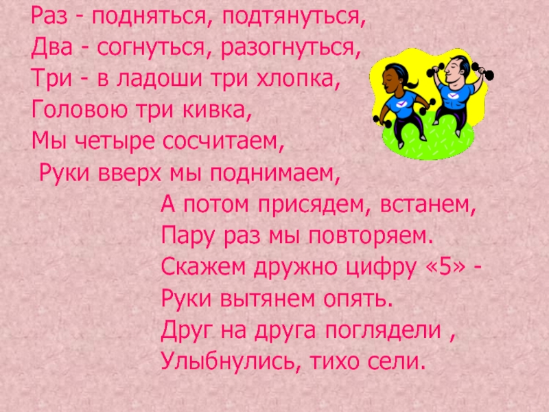 Раз - подняться, подтянуться, Два - согнуться, разогнуться, Три - в ладоши три хлопка, Головою три