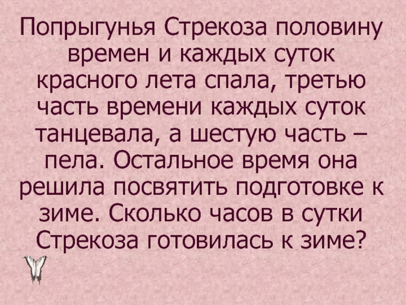 Попрыгунья Стрекоза половину времен и каждых суток красного лета спала, третью часть времени каждых суток танцевала, а