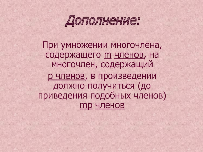 Дополнение:При умножении многочлена, содержащего m членов, на многочлен, содержащий p членов, в произведении должно получиться (до приведения