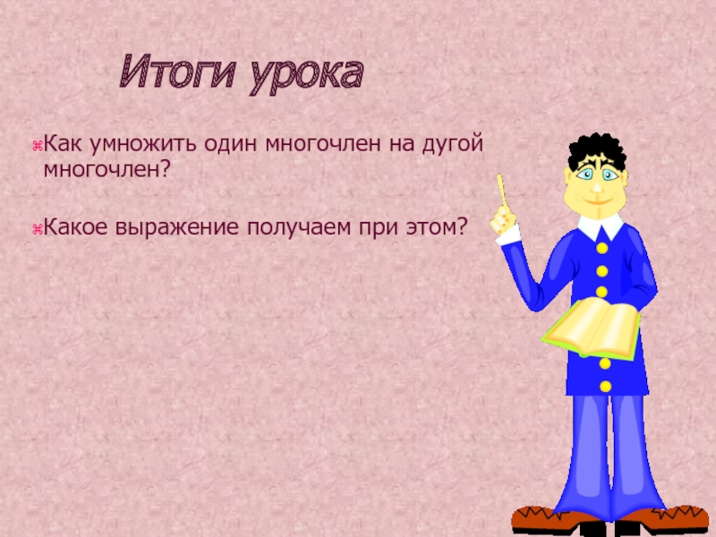 Итоги урока Как умножить один многочлен на дугой многочлен? Какое выражение получаем при этом?