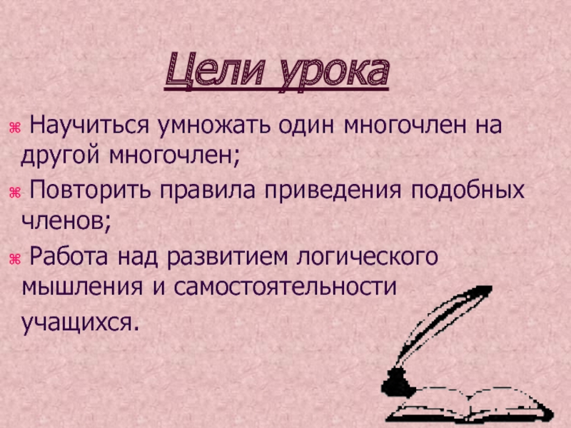 Цели урока Научиться умножать один многочлен на другой многочлен; Повторить правила приведения подобных членов; Работа над развитием