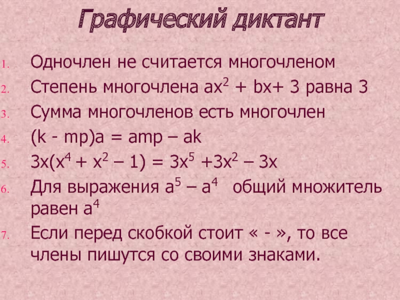 Графический диктантОдночлен не считается многочленомСтепень многочлена ах2 + bx+ 3 равна 3Сумма многочленов есть многочлен(k - mp)a