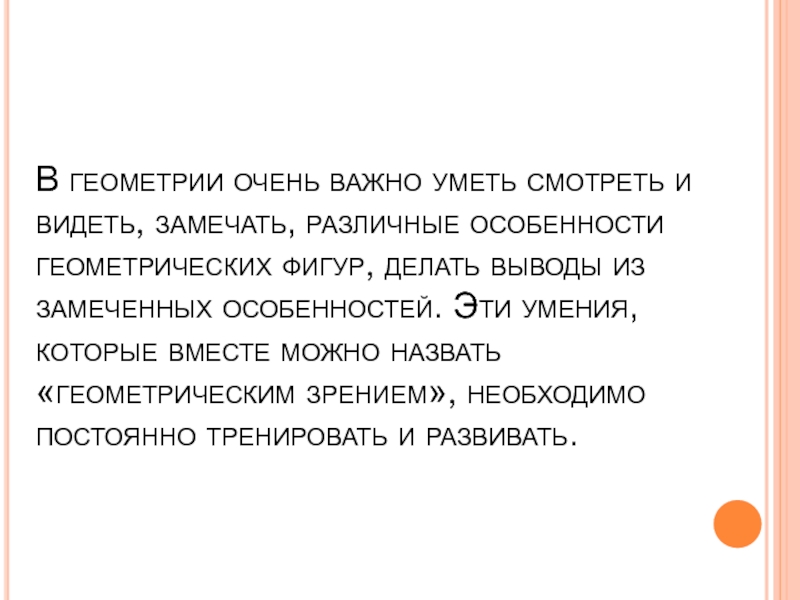 В геометрии очень важно уметь смотреть и видеть, замечать, различные особенности геометрических фигур, делать выводы из замеченных