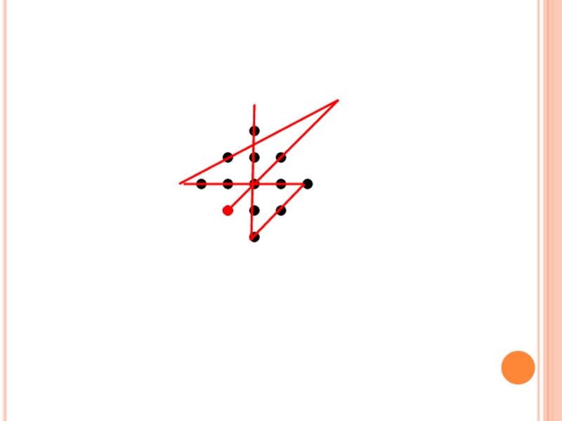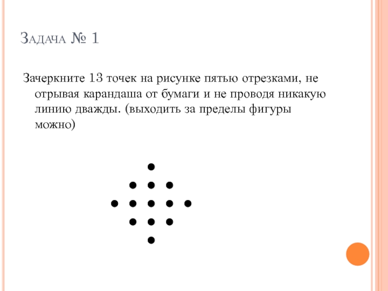 Задача № 1Зачеркните 13 точек на рисунке пятью отрезками, не отрывая карандаша от бумаги и не проводя