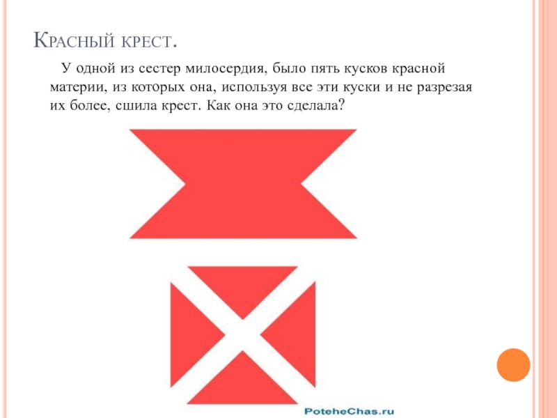 Красный крест.	У одной из сестер милосердия, было пять кусков красной материи, из которых она, используя все эти