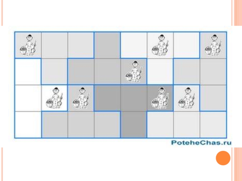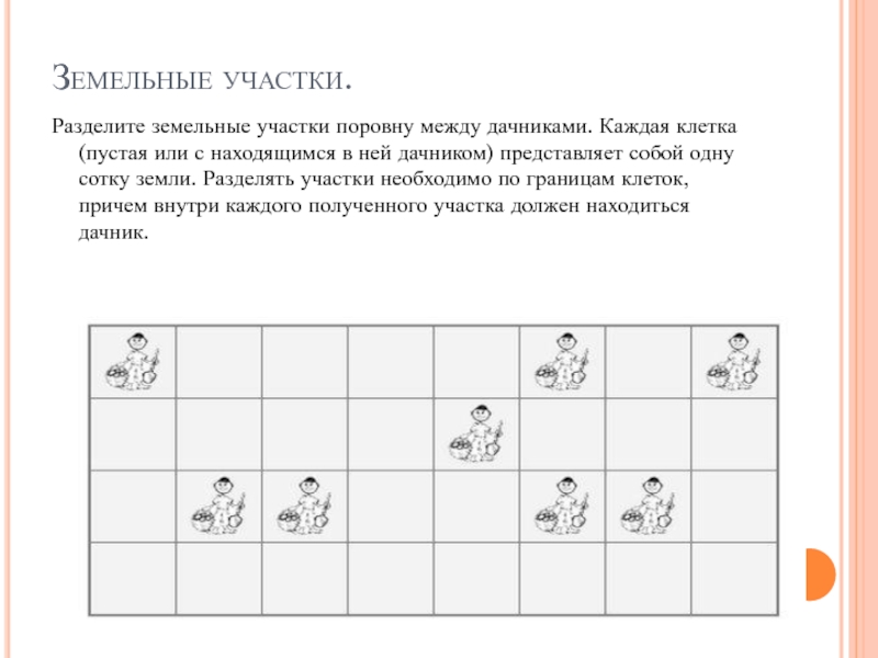 с находящимся в ней дачником) представляет собой одну сотку земли. Разделять участки необходимо по границам клеток, причем внутри каждого полученного участка должен находиться дачник.