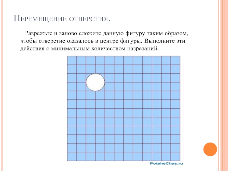 Перемещение отверстия.	Разрежьте и заново сложите данную фигуру таким образом, чтобы отверстие оказалось в центре фигуры. Выполните эти