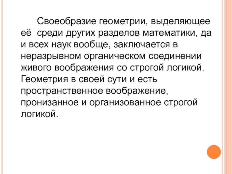 Своеобразие геометрии, выделяющее её среди других разделов математики, да и всех наук вообще, заключается в неразрывном органическом соединении живого воображения со строгой логикой. Геометрия в своей сути и есть пространственное воображение, пронизанное и организованное строгой логикой.