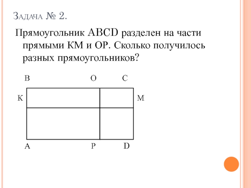 Задача № 2.Прямоугольник ABCD разделен на части прямыми КМ и ОР. Сколько получилось разных прямоугольников?  В