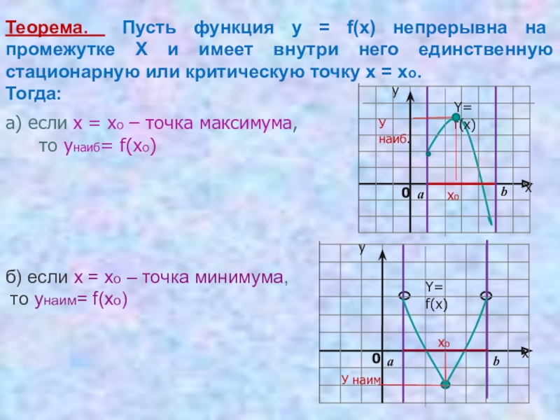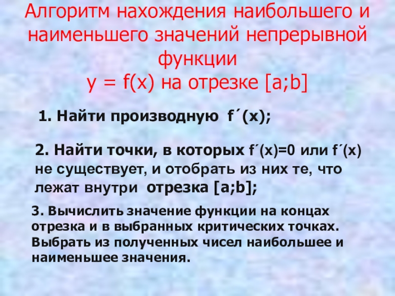 2. Найти точки, в которых f´(х)=0 или f´(х) не существует, и отобрать из них те, что лежат внутри oтрезка [a;b];