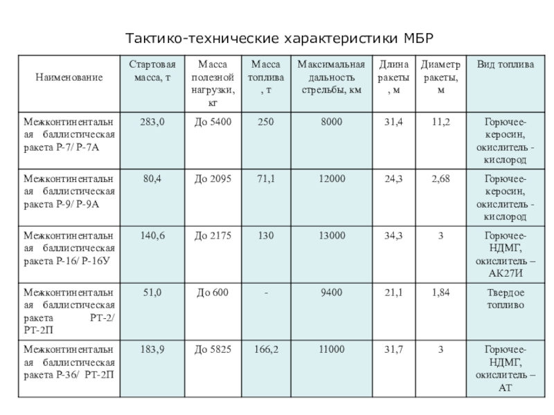 Баллистическая ракета имела: стартовую массу 5,5 т;массу боевого блока 1100 кг;длину – 10,3 М;диаметр – 0,88 м;