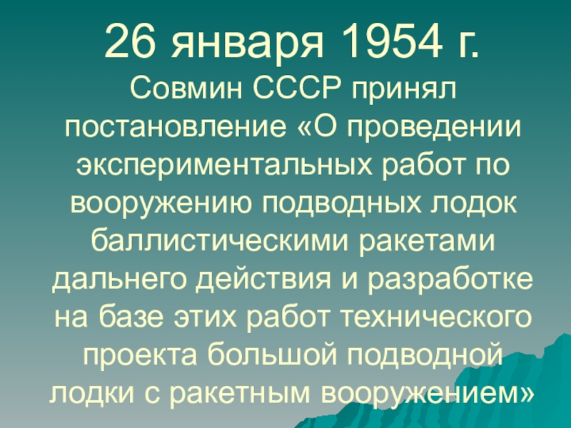 26 января 1954 г. Совмин СССР принял постановление «О проведении экспериментальных работ по вооружению подводных лодок баллистическими