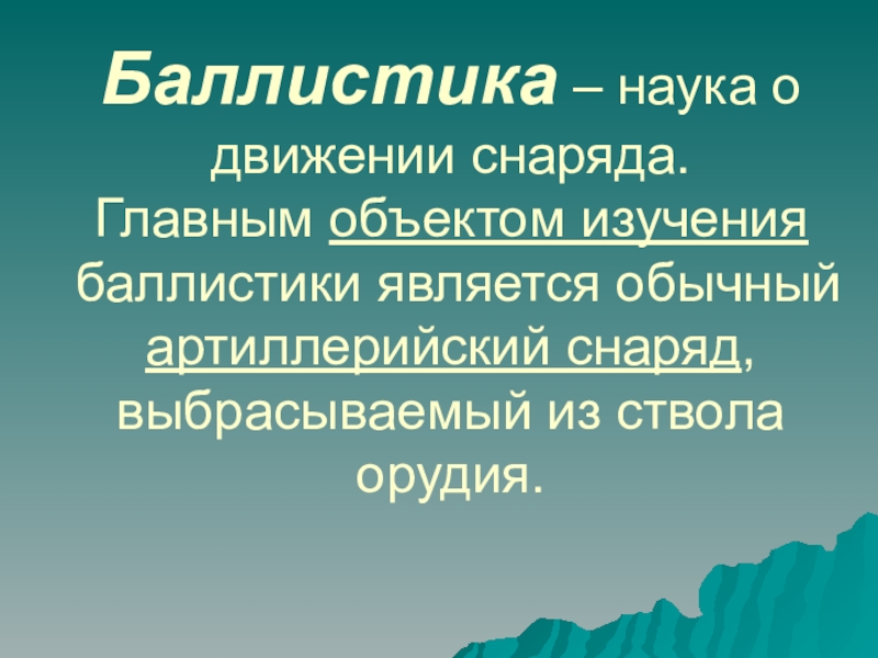 Слайд 10Баллистика – наука о движении снаряда. Главным объектом изучения баллистики является обычный
