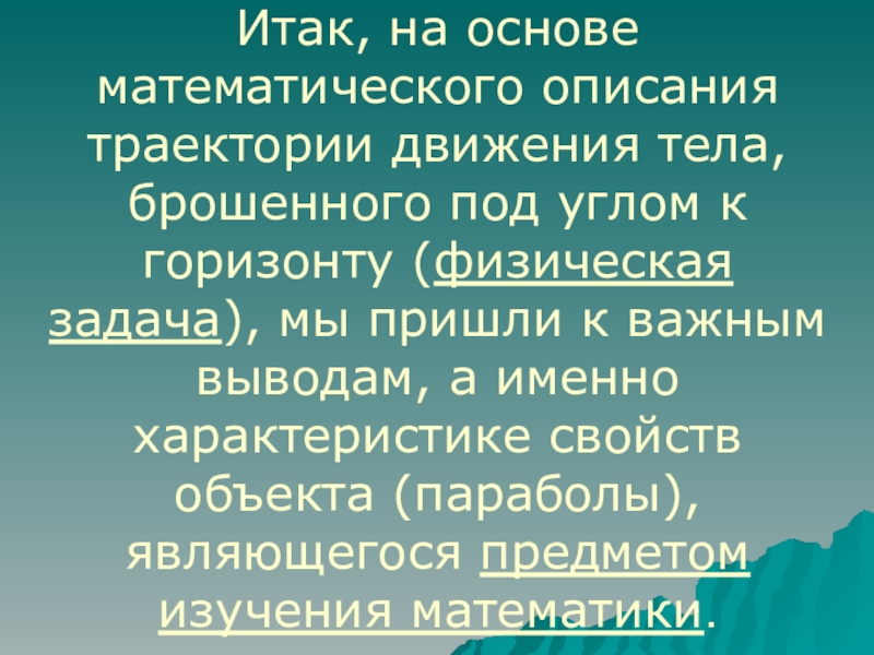 к горизонту (физическая задача), мы пришли к важным выводам, а именно характеристике свойств объекта (параболы), являющегося предметом изучения математики.