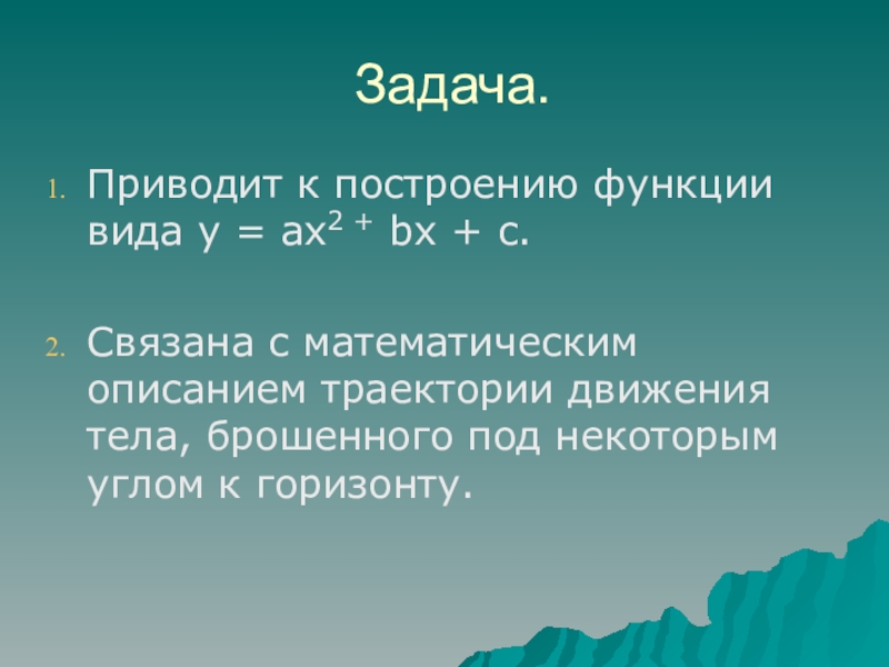 Задача.Приводит к построению функции вида у = ах2 + bx + c.Связана с математическим описанием траектории движения