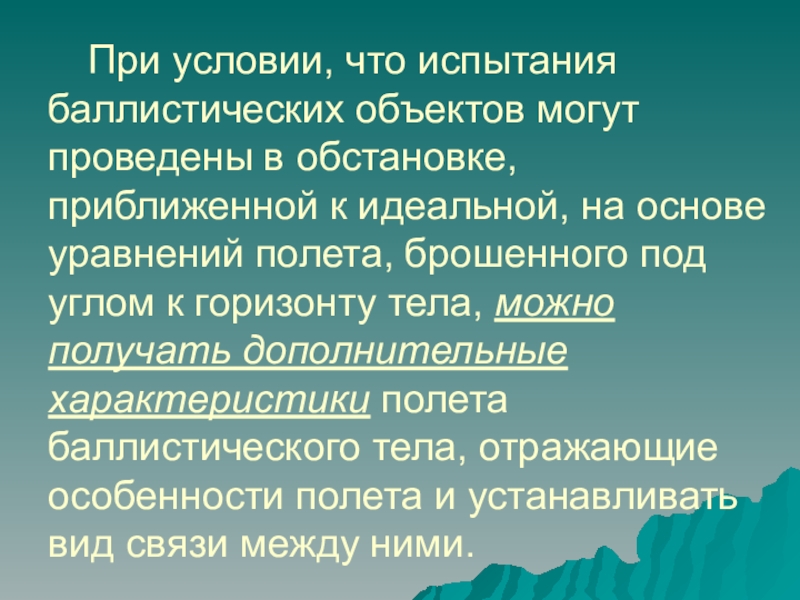 Слайд 3 При условии, что испытания баллистических объектов могут проведены в обстановке, приближенной