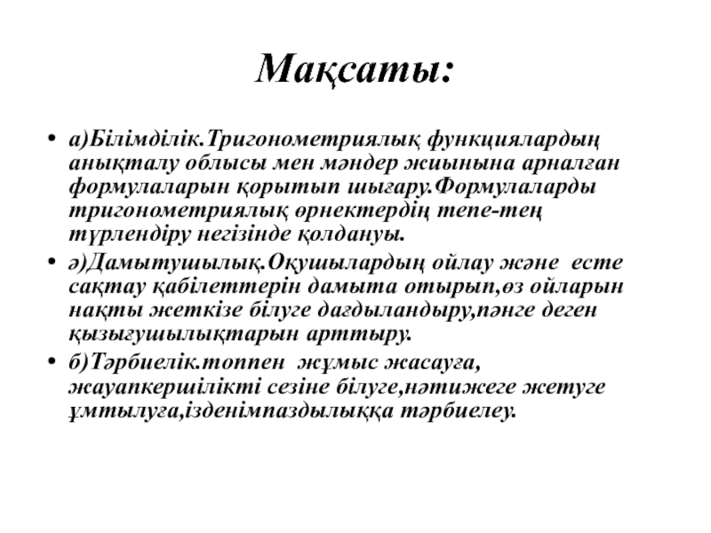 Мақсаты:а)Білімділік.Тригонометриялық функциялардың анықталу облысы мен мәндер жиынына арналған формулаларын қорытып шығару.Формулаларды тригонометриялық өрнектердің тепе-тең түрлендіру негізінде қолдануы.ә)Дамытушылық.Оқушылардың ойлау және есте сақтау қабілеттерін дамыта отырып,өз ойларын нақты жеткізе білуге дағдыландыру,пәнге деген қызығушылықтарын арттыру.б)Тәрбиелік.топпен жұмыс жасауға,жауапкершілікті сезіне білуге,нәтижеге