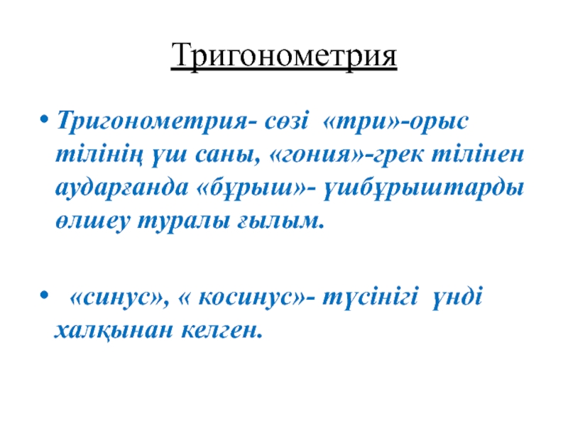 ТригонометрияТригонометрия- сөзі «три»-орыс тілінің үш саны, «гония»-грек тілінен аударғанда «бұрыш»- үшбұрыштарды өлшеу туралы ғылым. «синус», « косинус»-